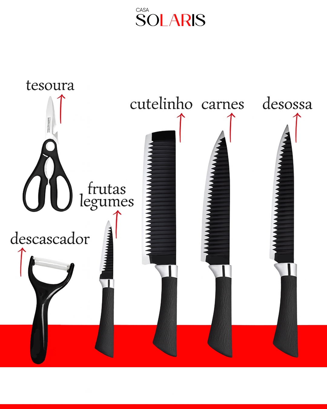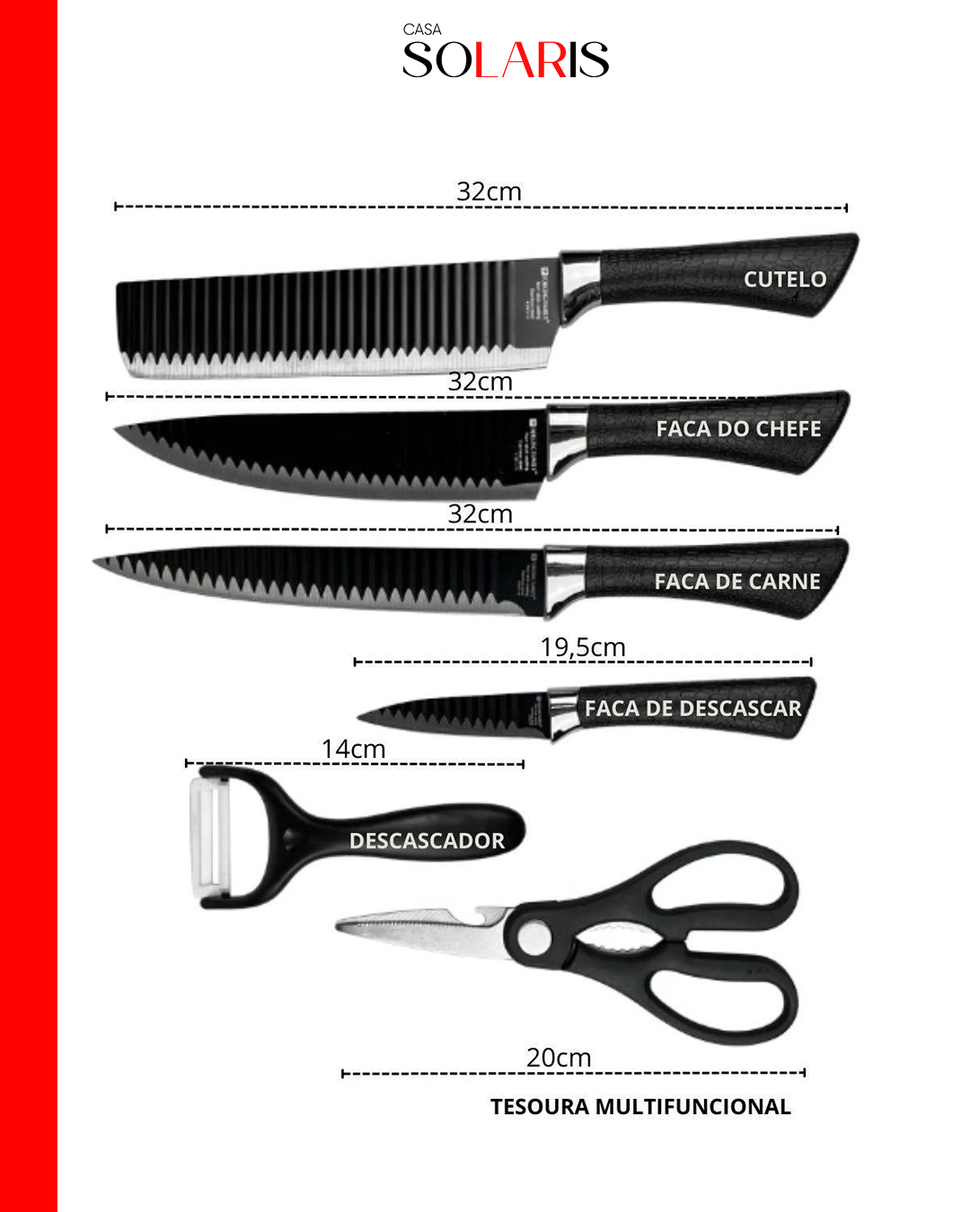 O Kit de Facas Solaris foi desenvolvido para oferecer praticidade, segurança e alta performance no preparo dos alimentos. Ideal tanto para chefs quanto para uso doméstico, ele conta com lâminas em aço inox de alta qualidade que proporcionam cortes precisos e maior durabilidade.