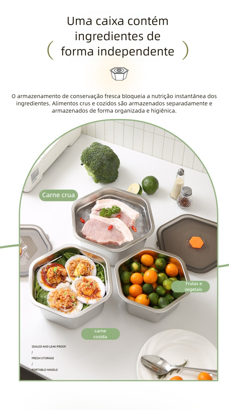 Mantenha seus alimentos frescos e bem armazenados com o Conjunto de Potes Herméticos em Aço Inox com tampas de acrílico transparente. Com design moderno em formato poligonal, são ideais para armazenar alimentos, levar refeições ou organizar a geladeira com praticidade e estilo.